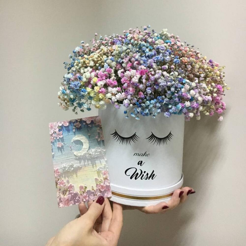 Шляпная коробка с цветной гипсофилой в Ак-Довураке