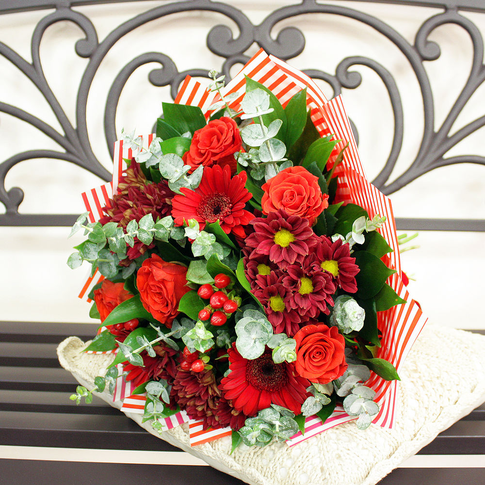 Изысканный авторский букет с розами сорта “Эльторра”, гермини и красной хризантемой, оформленный в дизайнерскую пленку. Восхитительный подарок по любому поводу.